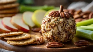 Creamy cheddar and cranberries shaped like a rustic acorn, finished with a crunchy pecan “cap” and a pretzel stem for a showy Thanksgiving or holiday board.