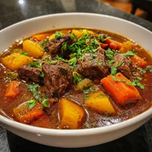 A hearty and flavorful beef stew that brings comfort and warmth to any gathering, featuring tender beef and fresh vegetables in a rich broth.