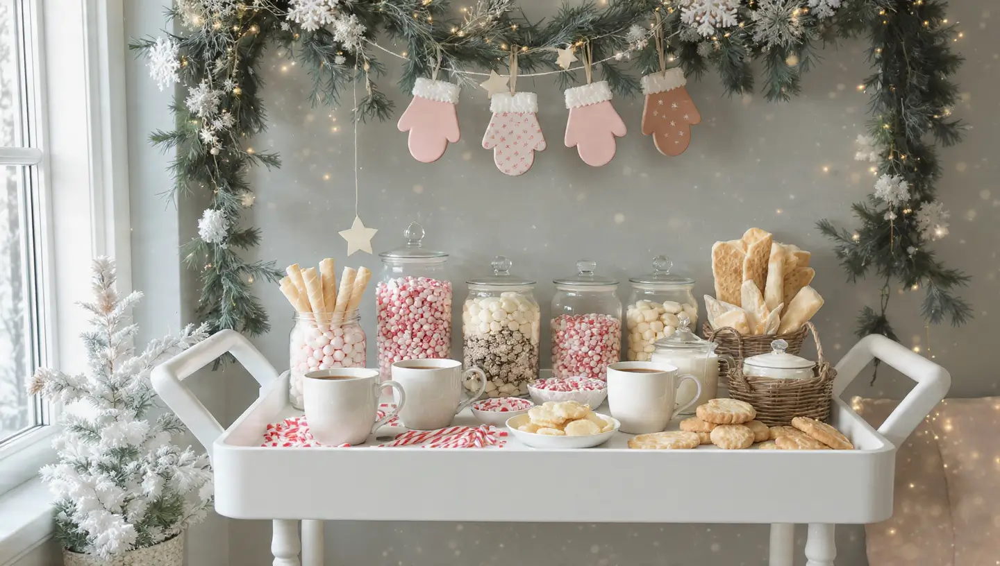 - Finish with snowflake picks, ribbons, or pastel accents. Refill toppings and cocoa as needed during the event.