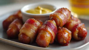 Bite-size sausages wrapped in caramelized bacon with a glossy brown-sugar finish that disappears fast from any platter.