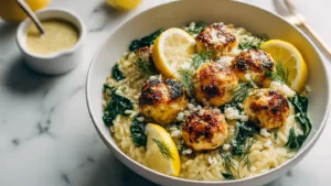 35 minutes • juicy baked chicken meatballs over lemony, creamy orzo (easy weeknight Mediterranean)