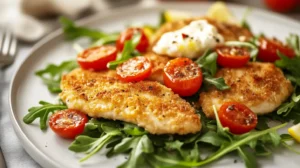 - Plate: Place hot cutlet on plate, crown with 2–4 oz burrata, spoon lemony arugula alongside or over, and finish with basil, fresh pepper, and a drizzle of olive oil.