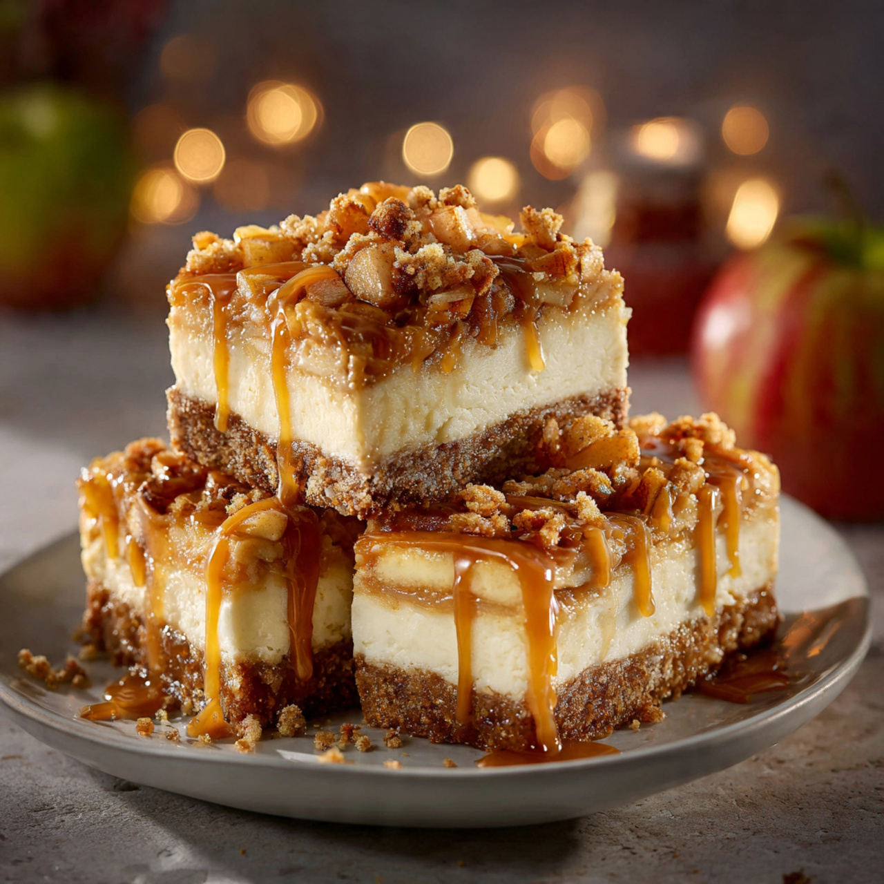 A delightful blend of creamy cheesecake, sweet apples, and rich caramel in a convenient bar form, perfect for sharing.