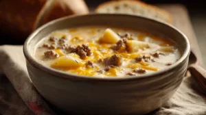 A rich, creamy potato soup loaded with seasoned ground beef and melty cheddar—weeknight-easy and built for chilly nights.