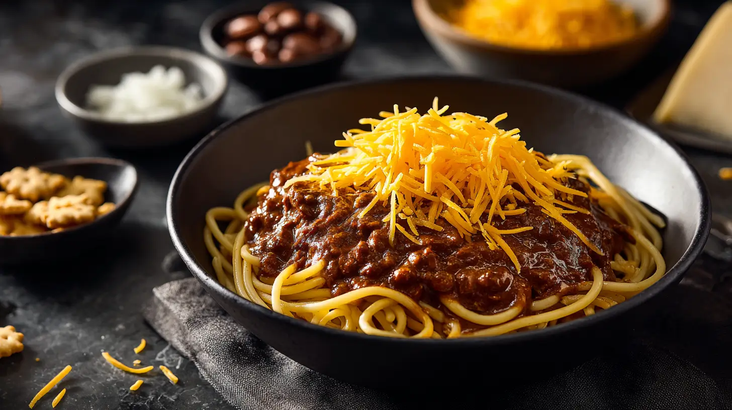 - Cook spaghetti & assemble: Pile hot spaghetti in bowls, ladle chili, then finish “ways” (see below).