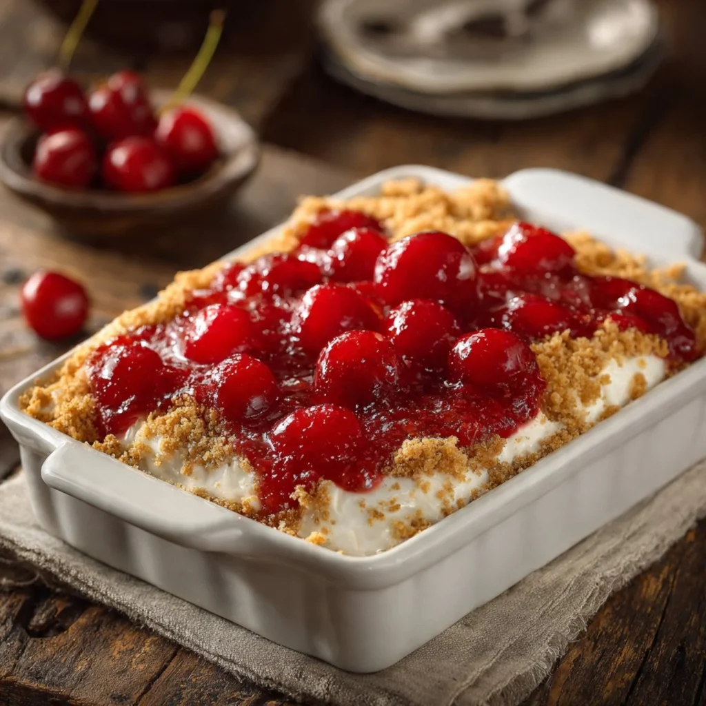 A delightful no-bake dessert with a sweet graham cracker crust, creamy filling, and luscious cherry topping, perfect for gatherings.