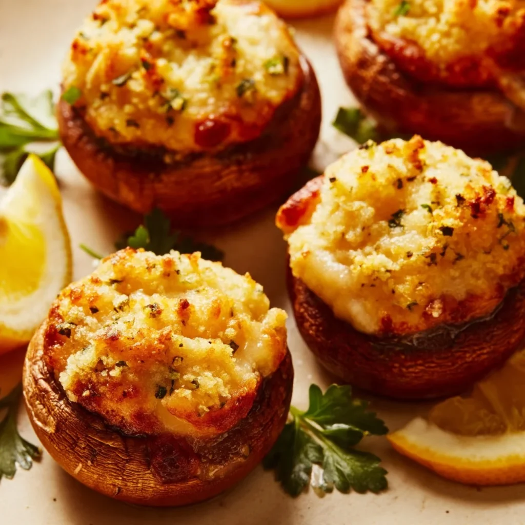 - Stuff each mushroom cap with the crab mixture.