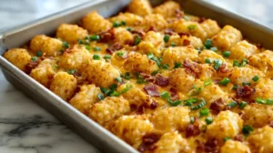 Golden tater tots, fluffy eggs, crisp bacon, and sharp cheddar—finished with cool ranch and green onion for a brunched-up, crowd-pleasing breakfast casserole.