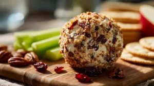 A creamy cheddar–cranberry cheese ball rolled in toasted pecans that sets up quickly in the fridge and looks gorgeous on every Thanksgiving or holiday board.