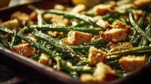 Sheet-pan roasted green beans tossed with garlic-butter crumbs, Parmesan, and lemon. Crisp, flavorful, and perfect for holidays or weeknight dinners.