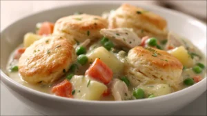 Tender chicken and vegetables simmer in a scratch-made creamy gravy, then get topped with golden biscuits for that classic pot pie vibe.