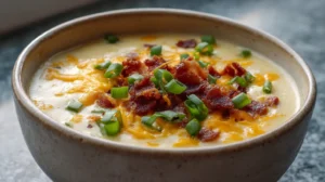 Thick, velvety potato soup swirled with ranch, melty cheddar, and cream cheese, finished with crispy bacon and green onion for that “crack” bite.