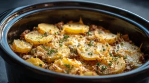 A stack of tender potatoes, seasoned ground beef, and melty cheddar in a creamy gravy, scoopable comfort that basically cooks itself.