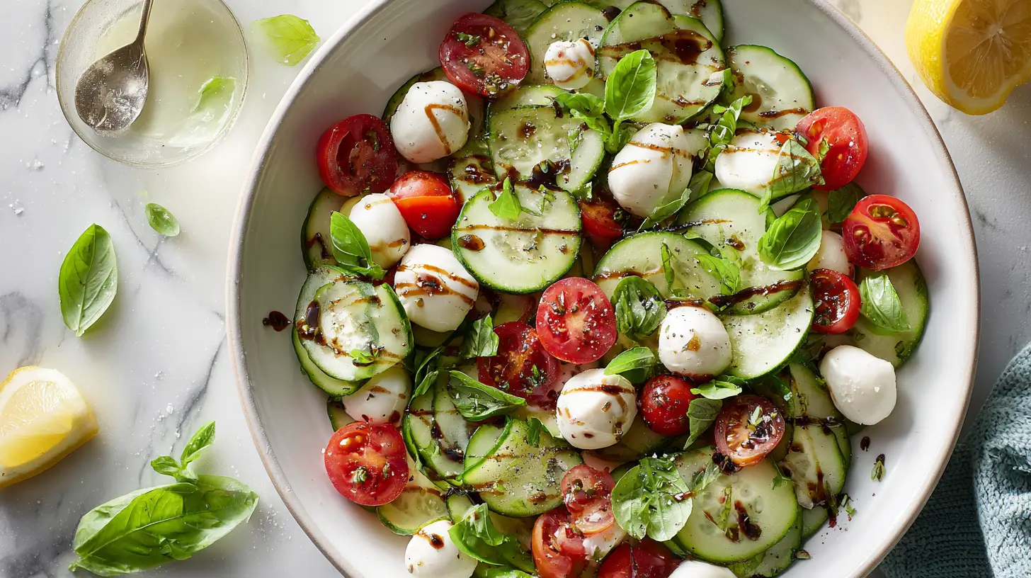 - Light but satisfying: Hydrating cucumbers + mozzarella pearls keep it fresh.