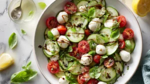 - Combine: Add cucumbers, tomatoes, mozzarella, and red onion; toss gently.
