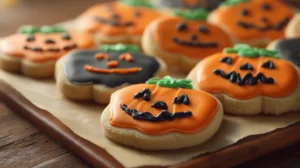 A crisp-tender sugar cookie that holds its shape, topped with shiny royal icing you can pipe into friendly or spooky jack-o’-lantern faces for parties, school treats, or a Halloween dessert tray.