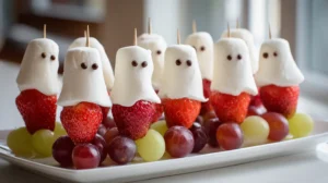 3. Skewer – Thread grape, strawberry, banana, then a marshmallow ghost on top. Repeat for 12 skewers.