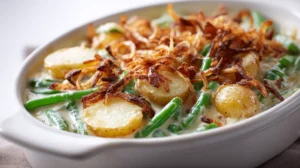 Creamy, crunchy, and table-ready in ~55 minutes, green beans, golden potato coins, and a crackly onion top.