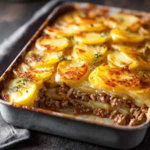 A family-friendly, grain-free ground beef and potato bake layered with onions and a quick savory pan sauce. Minimal prep, one pan, weeknight cozy.