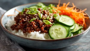 Quick, flavor-packed Korean-inspired beef bowls featuring sweet-heat gochujang sauce, crisp cucumbers, and carrots over fluffy rice. Ready in 20 minutes and perfect for meal prep or weeknight dinners.