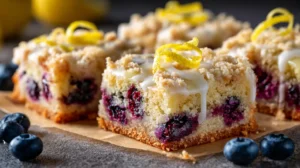 Chilled or room-temp squares topped with curls of lemon zest and a few fresh blueberries. For parties, add whipped cream and extra berries for a sundae-style bar.