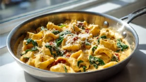 Creamy sun-dried tomato Parmesan sauce that clings to pillowy tortellini, easy tortellini recipe for fast Italian dinners.