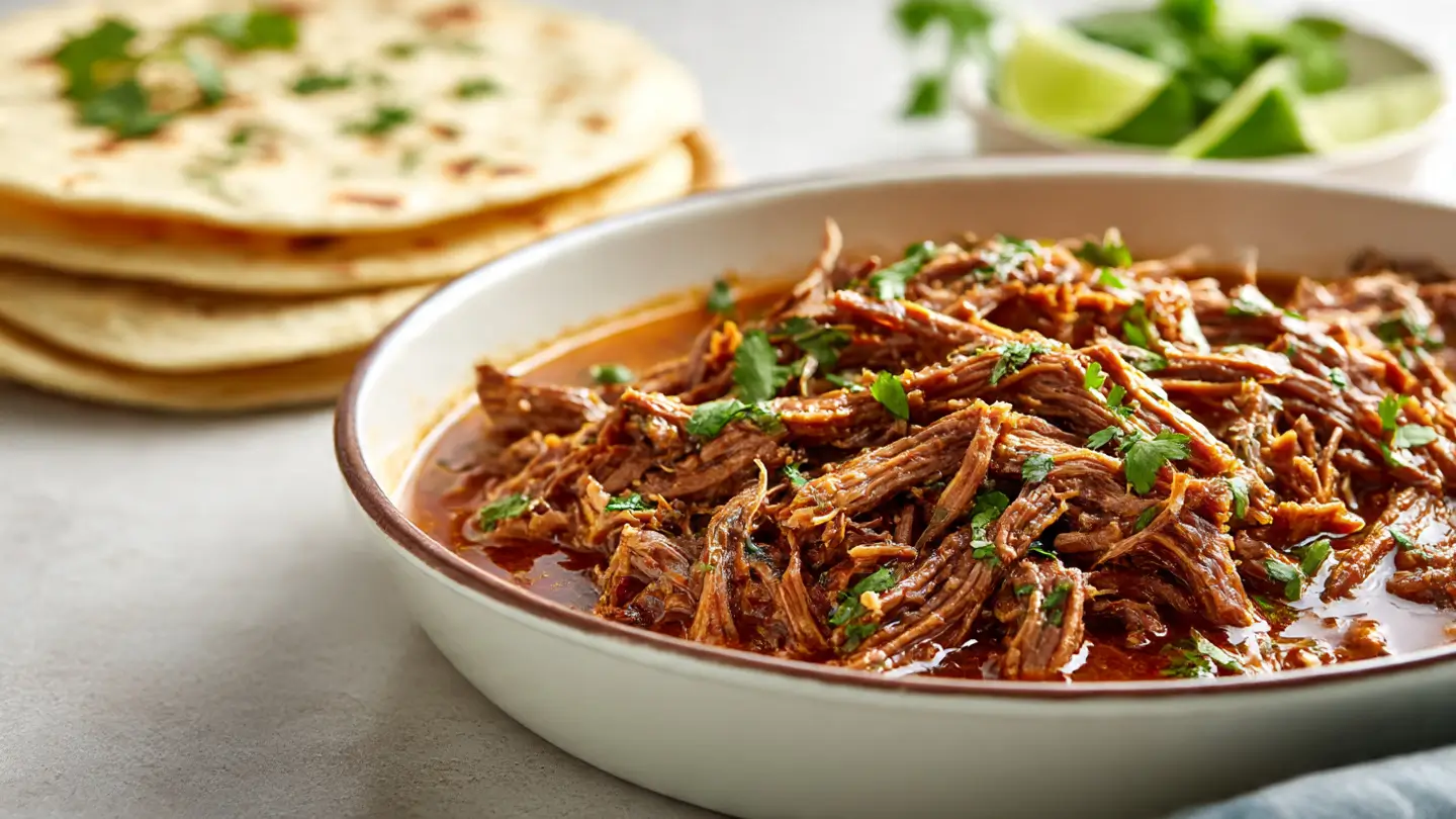 Instant Pot: High pressure 60–70 minutes; natural release 15 minutes, then quick release. - Transfer beef to a board; shred with forks. Skim fat from juices and simmer them 5–10 minutes to reduce slightly. Toss beef in reduced juices and adjust seasoning with lime or salt.