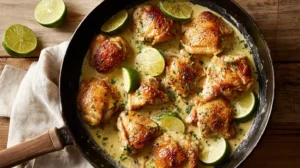 Creamy, zesty, weeknight easy. Chicken thighs simmer in coconut milk with fresh lime, garlic, and ginger until tender and full of flavor. Everything cooks in one skillet in about 30 minutes. Trust me, you’re going to love this.