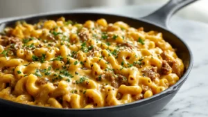 All the flavors of a juicy cheeseburger, savory beef, ketchup–mustard tang, and melty cheddar, tossed with tender macaroni in one cozy pan.