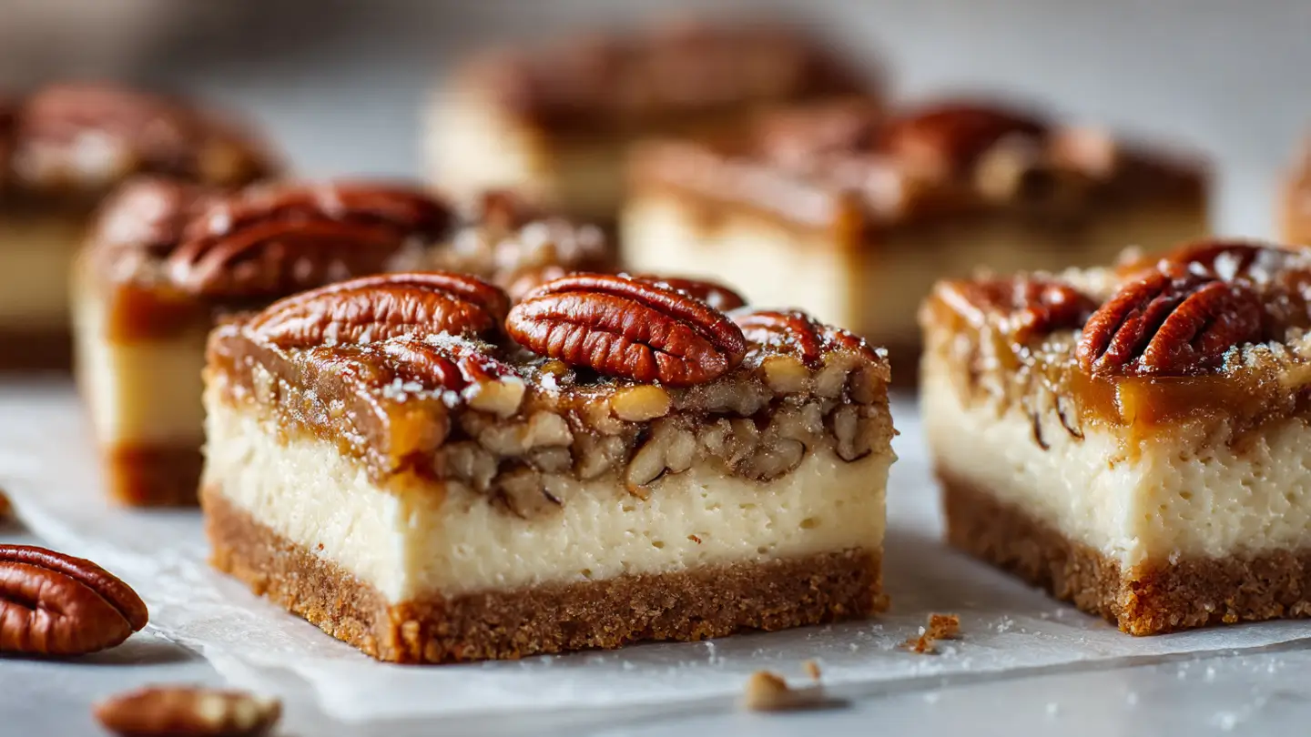 Sliceable holiday bars with clean layers, glossy pecans, and a cheesecake bite that holds up on a dessert tray.