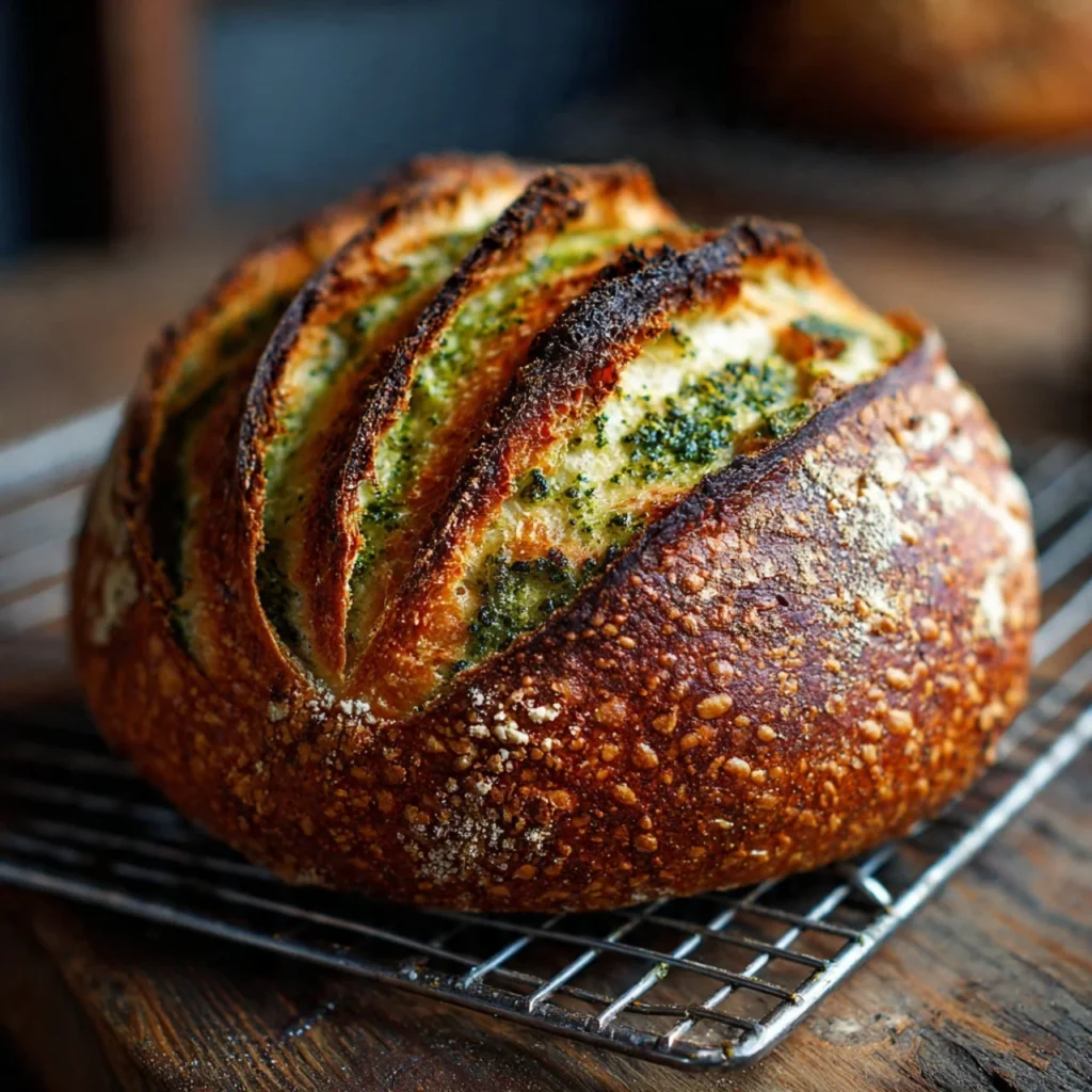 A delicious and comforting bread that combines tangy sourdough with the rich flavors of basil pesto and parmesan cheese, perfect for elevating any meal or snack.