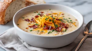 - Serve: Ladle into bowls; top with bacon, chives, and more cheddar.