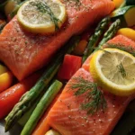 • Drizzle olive oil and lemon juice over the salmon and vegetables.