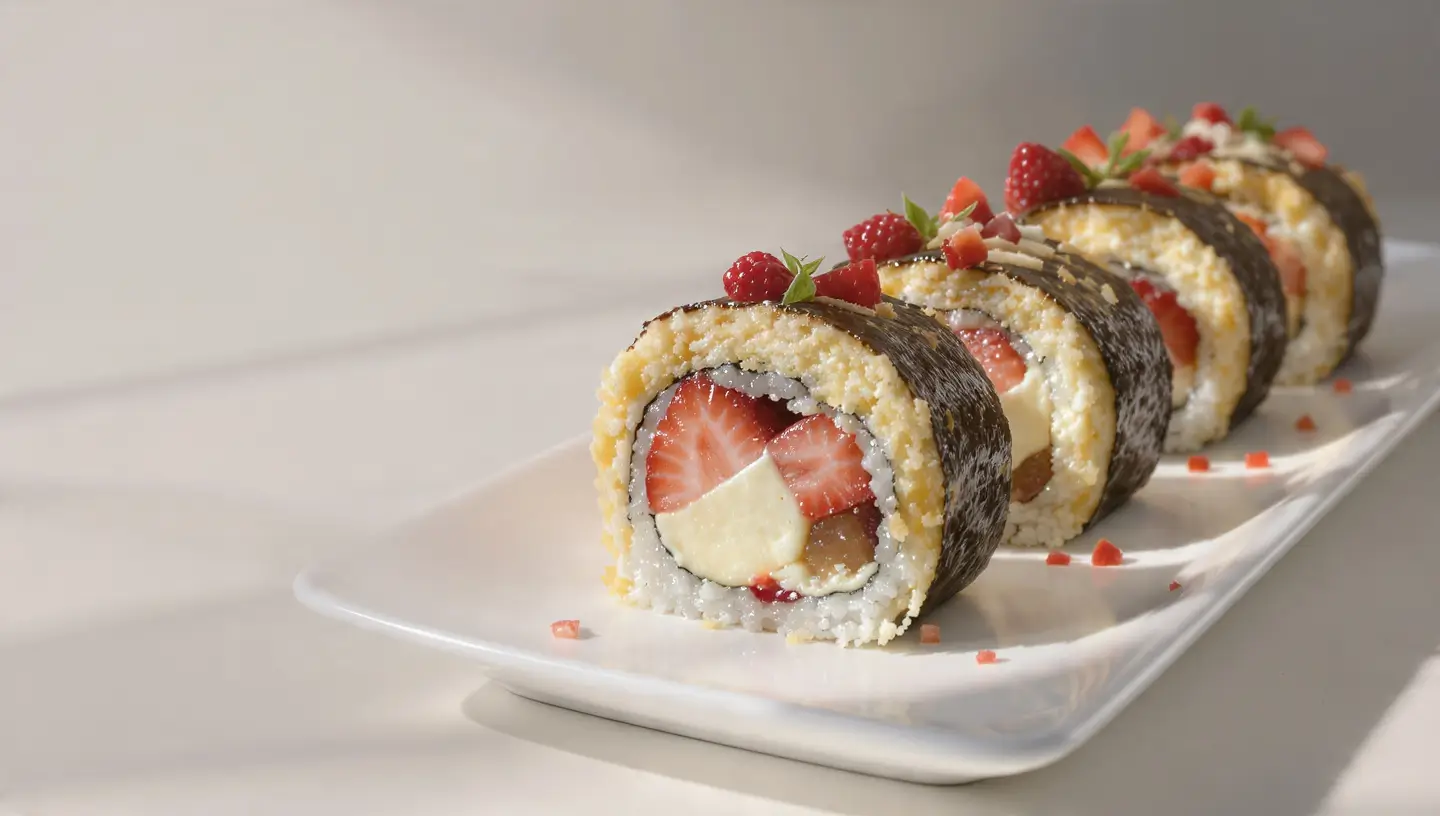 - Fill & roll (4–5 min): Spread a thin, even layer of cream over “rice,” leaving a ½-in border on one long edge. Arrange a tight line of berries across the opposite long edge. Roll tightly (use parchment like a sushi mat) toward the bare edge to seal.