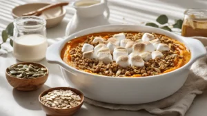 - Sweet Potato Casserole No Pecans: Crunchy topping without nuts—oats + pumpkin seeds.